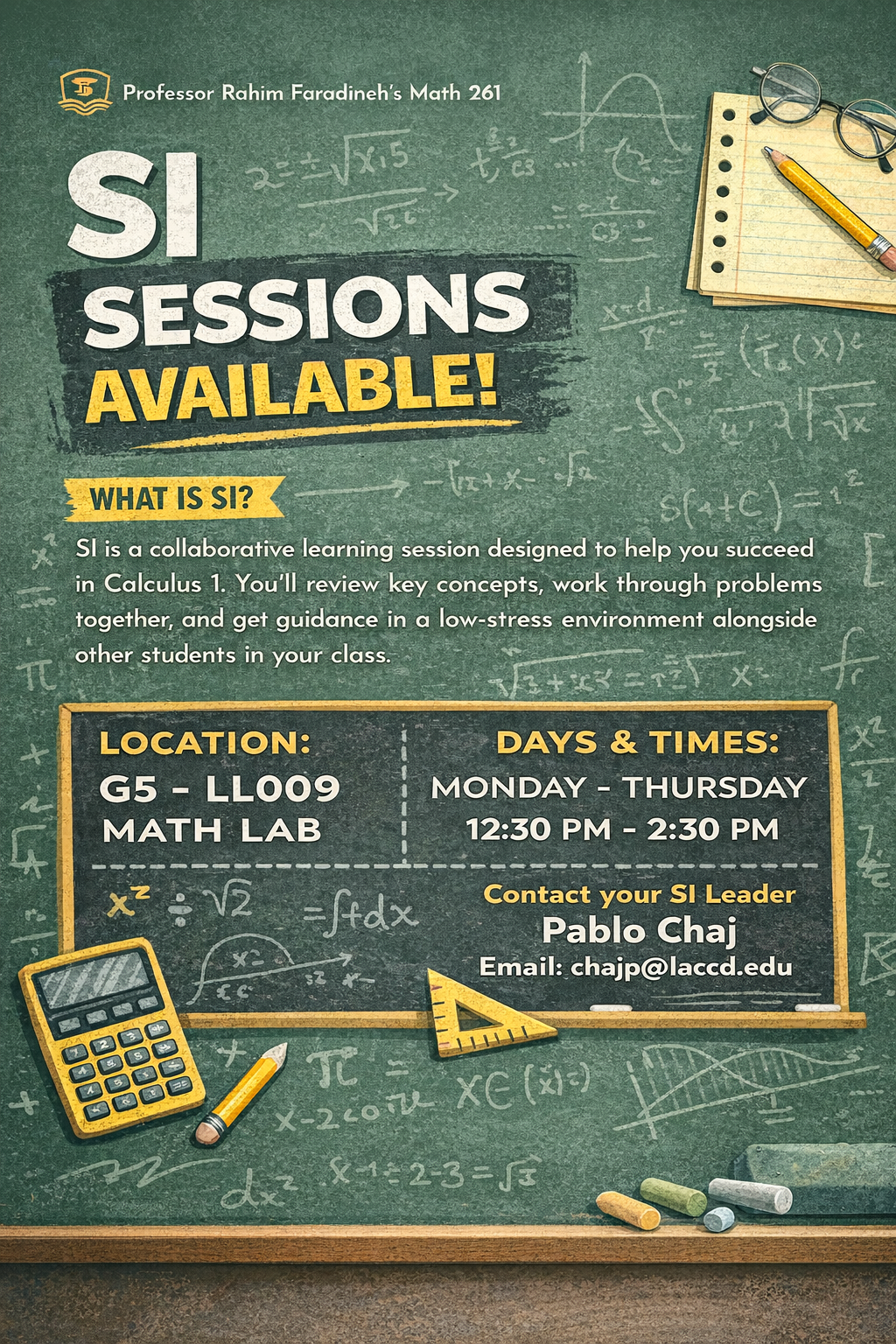 In addition to math Tutoring Lab, the mathematics department offers SI Program to support student success. Here is the SI schedule for this semester: |